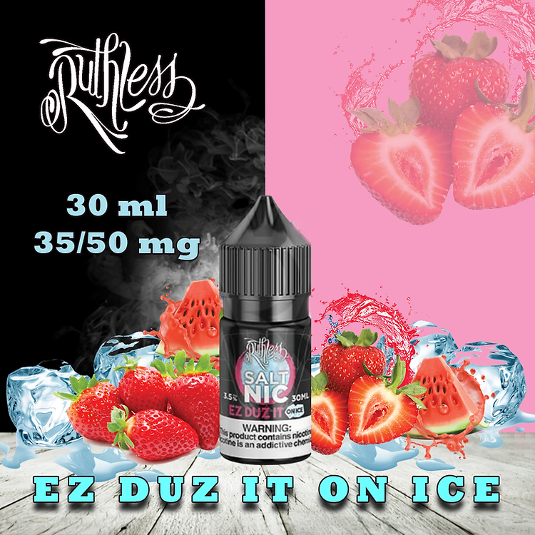 Ruthless Nic Salt EZ DUZ IT ON ICE combines the sweetness of strawberries and watermelon with the coolness of menthol, creating a refreshing and invigorating flavor profile. Each puff delivers a burst of fruity sweetness followed by a cooling sensation, making it an ideal choice for hot summer days or whenever you need a refreshing pick-me-up.
