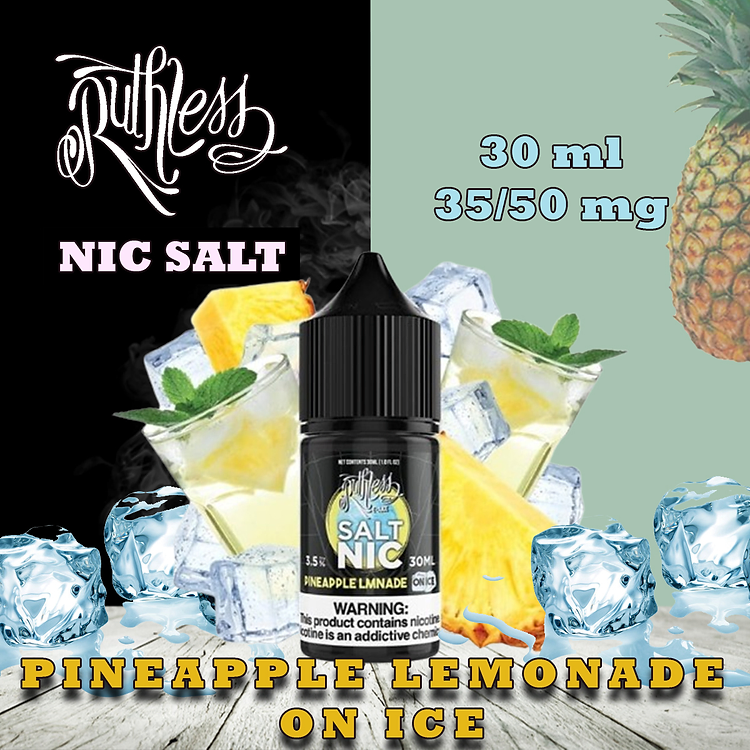 A: Ruthless Salt Nic Pineapple Lemonade On Ice is available in 35mg and 50mg nicotine strengths.